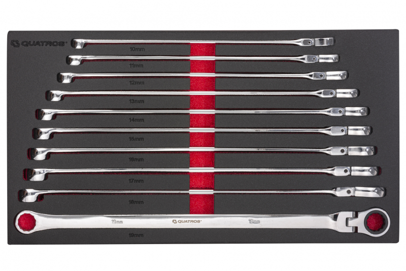 - 10dílná extra dlouhá sada dvojitých očkových klíčů s ráčnou a flexibilními hlavami 10-19 m