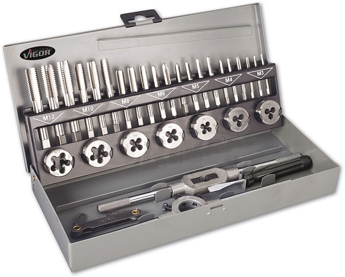 32-dílná sada sadových závitníků a kruhových závitových čelistí VIGOR