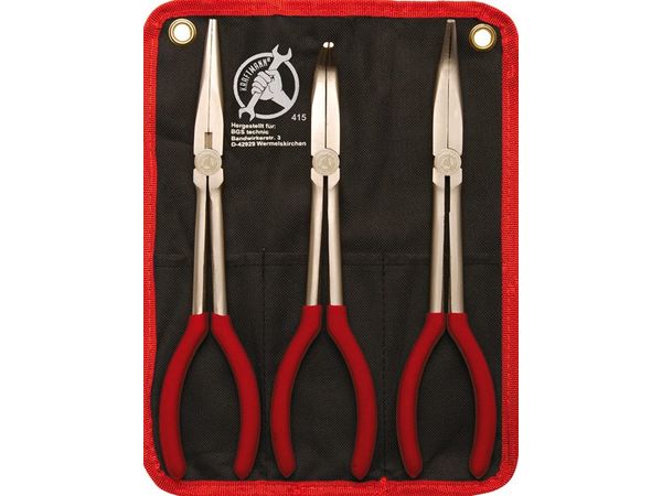 Sada kleští na jemnou mechaniku – zahnuté a rovné čelisti, extra délka 260-285 mm, 3 kusy v látkovém obalu s očky – Kraftmann 415