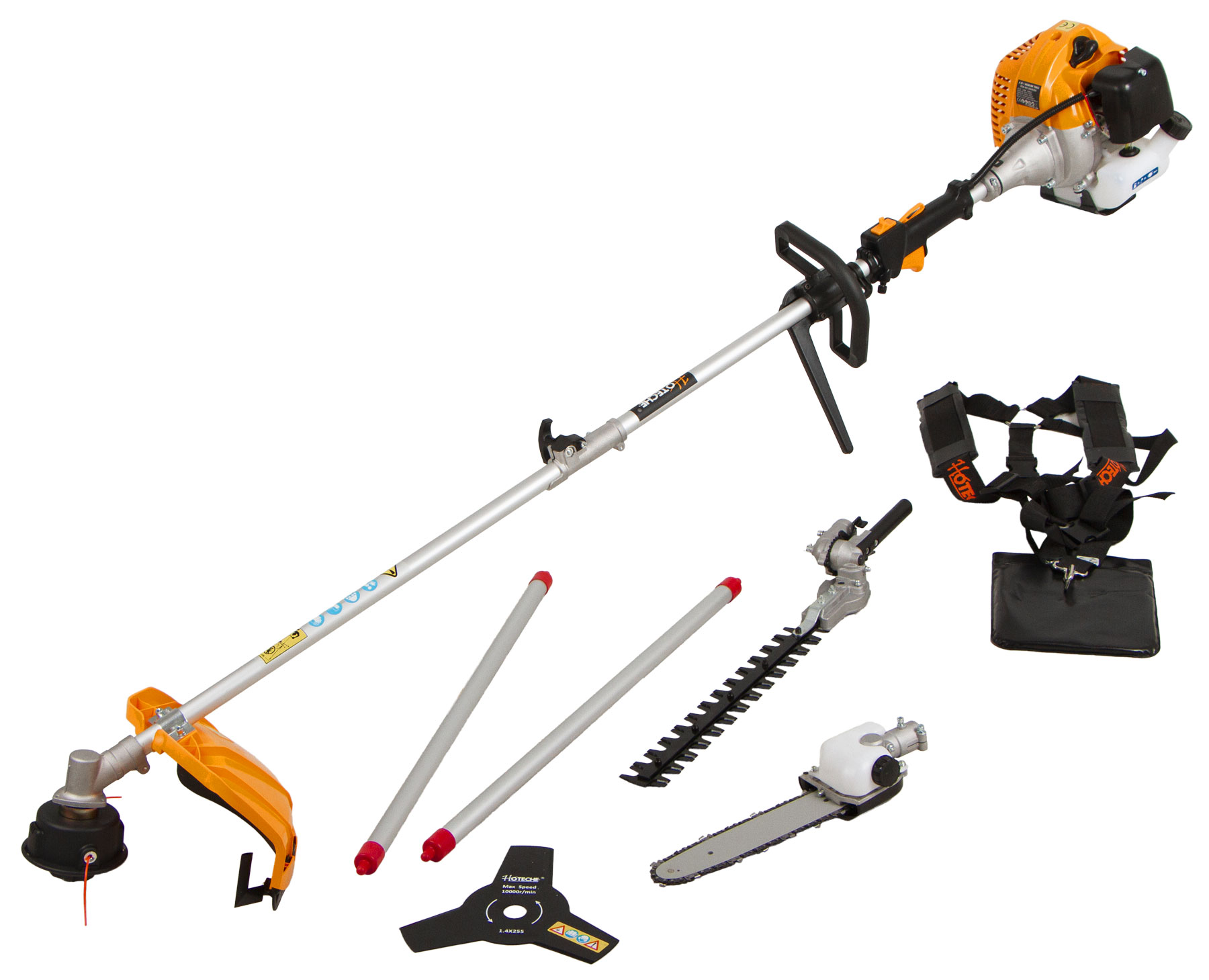 Multifunkční křovinořez 4v1 Hoteche v sobě skrývá křovinořez, strunovou sekačku, nůžky na živý plot a motorovu pilu.