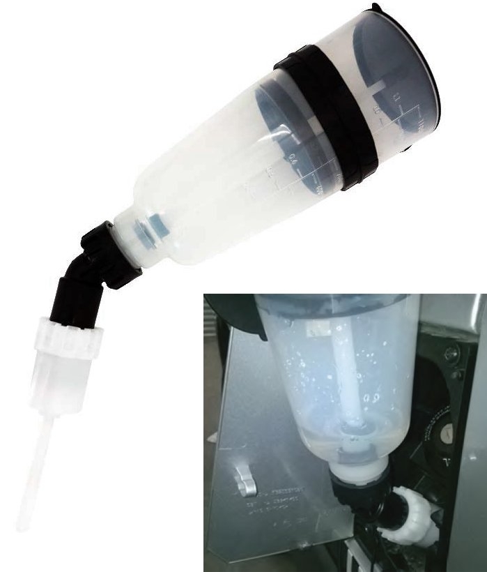 - průhledný trychtýř v zahnutém provedení (45°) má měřicí stupnici a objem 1100 ml