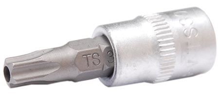 Hlavice zástrčné Torx TS, pěticípé s otvorem, matně chromované.
