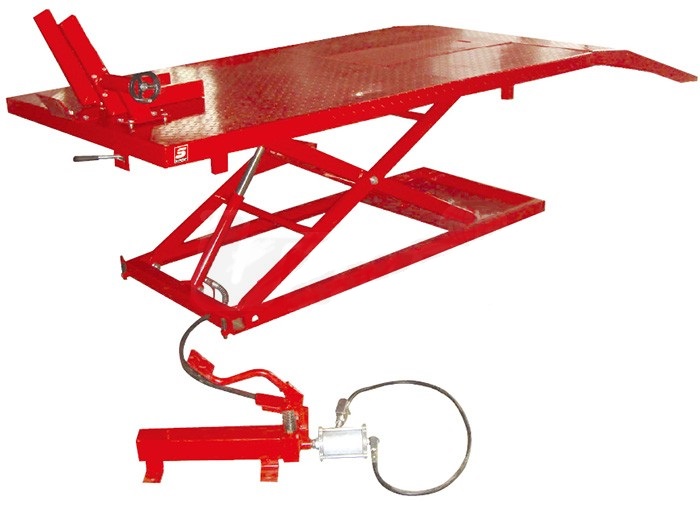 Standardní hydraulicko-pneumatický zvedák s rozměrnější plošinou, s nůžkovou zvedací konstrukcí a s pedálovým pneumatickým ovládáním je určený pro zvedání motocyklů, čtyřkolek ATV/Quad, případně malou zemědělskou mechanizaci, při jejich profesionální údržbě a opravách.
