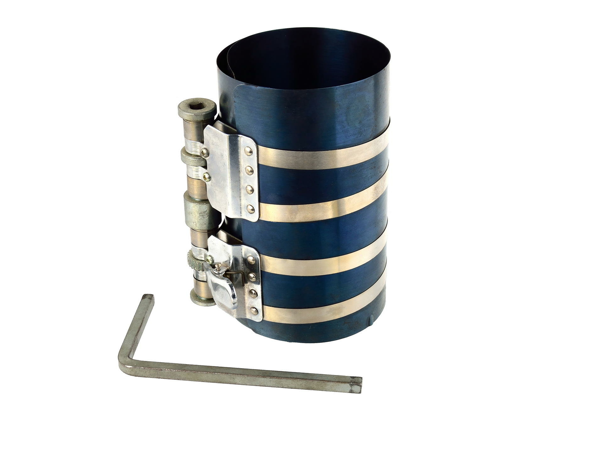 Přípravek na stlačení pístních kroužků, který zachovává jejich požadovaný tvar. Pás je vyroben z nerezové oceli, která je velmi flexibilní. Upínací mechanismus a šnekový převod je vyroben z nerezové oceli.