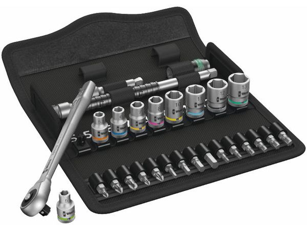 28dílná sada 1/4" ráčny Wera Zyklop Metal 8100 SA 7 v kompaktním, vysoce robustním textilním boxu s ochranným povrchem. Nízký objem a hmotnost pro snazší mobilitu.