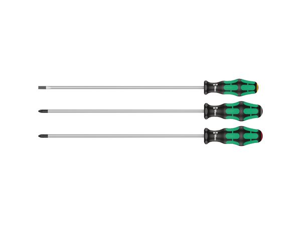 Wera 347735. Sada prodloužených šroubováků Kraftform Plus 335/350/355/3 (3 díly) Wera Kraftform Plus - řada 300 je odpověď téměř na každý šroub včetně identifikátoru nářadí "Take it easy". 3 šroubováky Kraftform Série 300 - pro šrouby s křížovou drážkou PH (Phillips-Recess), PZ (Pozidriv) a šrouby s plochou drážkou Identifikátor nářadí „Take it easy“: Barevné označení podle profilů a velikostních stupnic Vícekomponentní rukojeť Kraftform™ Plus - pochopitelná ergonomie. šetří celou ruku i paži. Provedení s šestihrannou ochranou před odkutálením