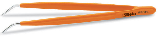 - Zahnutá tenká vroubkovaná špičatá pinzety vyrobené z nerezové oceli s PVC povlakem